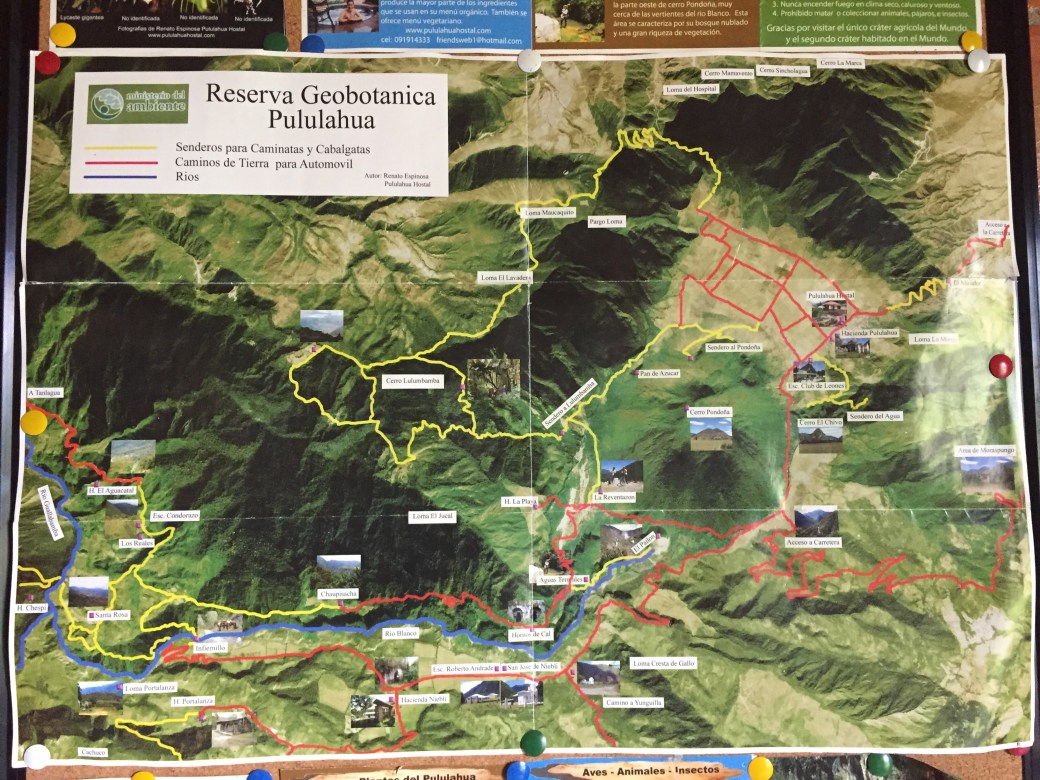 Bazıları asırlardan kalmış olanlar dahil, büyük tarım çiftliklerine ev sahipliği yapan bu muhteşem kraterin içine girdikten sonra etrafta işaretlerini gördüğümüz bir kaç tepeye tırmanıp akşam üzeri geri döneriz diye planladık. Tüm sabah her yerde yerel bir harita aradık ama bize böyle bir haritanın var olmadığını söylediler. Öğlen yemeği menüsünü öğrenmek için girdiğimiz kraterde gittiğimiz küçük hostelindeyken ben duvarda bir kaba taslak yürüyüş yollarını gösteren bir harita gördüm ve resmini çektim. Günün geri kalanında bu resme çok ihtiyacımız olacaktı!
